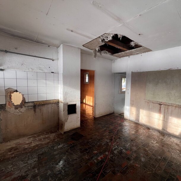 Als nächster Schritt wurden die Deckenplatten, die Vertäferung und mehrere Wände entfernt.