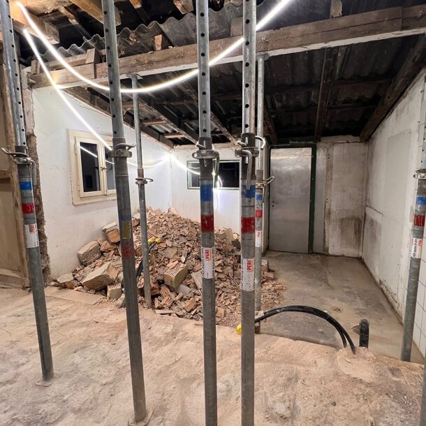 Im Dezember kam zum ersten Mal eine Baufirma ins Pfadiheim. Sie stützten einen Dachbalken und entfernten dann die tragende Wand. Der anfallende Schutt wurde dann durch uns am Wochenende mittels unzähligen Schubkarrenladungen zur Mulde transportiert.